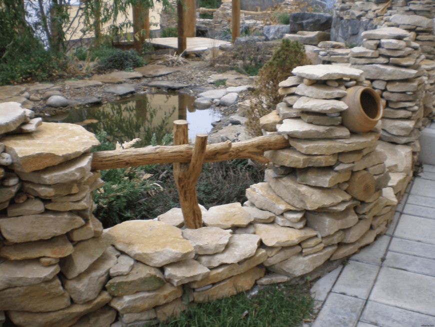 Камень тщательно подбирают по форме и укладывают плотно друг к другу на цементном растворе, что обеспечивает высокую прочность конструкции. С помощью гранитного камня удобно выполнять зонирование территории сада, разделения овощных грядок. Для декоративного ограждения небольшого цветника бутовым камнем можно обойтись без устройства фундамента.