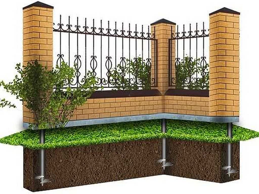 Забор с кирпичными столбами на свайном фундаменте с ростверком