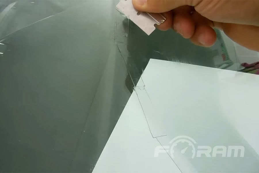 Лезвие держим перпендикулярно стеклу даже во время движения, и не сильным нажатием счищаем лишний полимер.