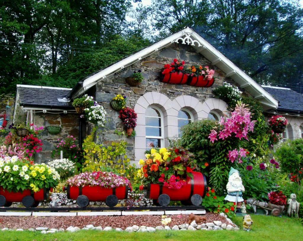 Так же для декора двора используют разные вазоны, старые башмаки, бочки, садовый инструмент, старые велосипеды, кувшины и тому подобное.