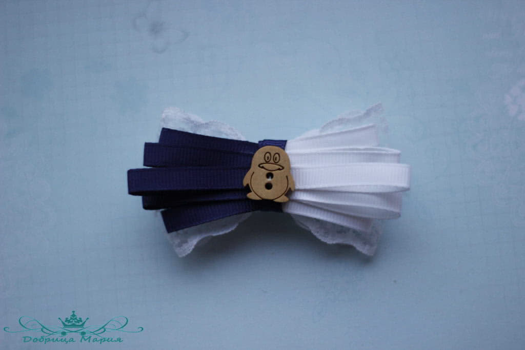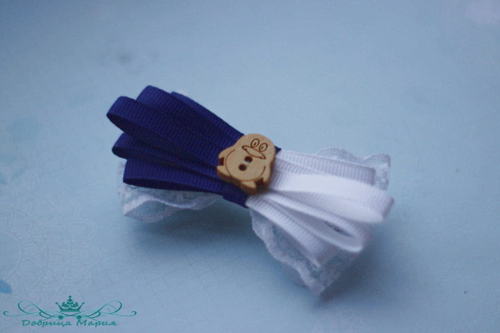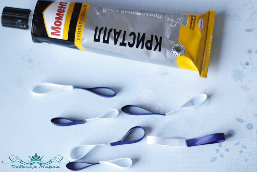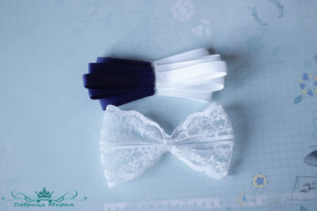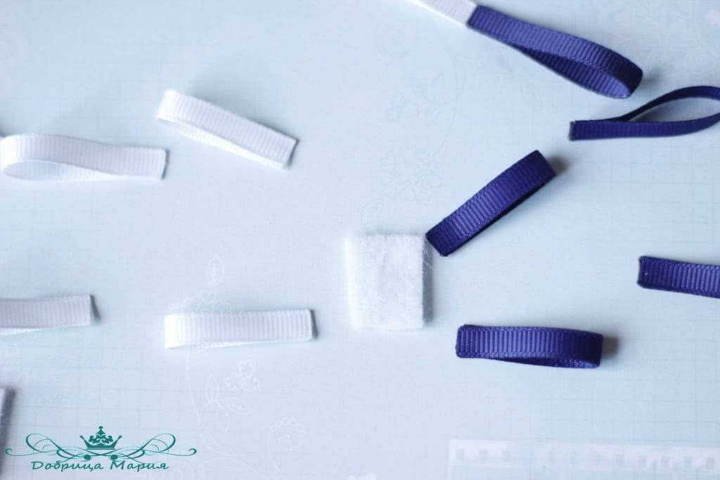 Следующий бантик у нас будет состоять из узкой репсовой ленты 0, 5 см шириной белым и синим цветом.