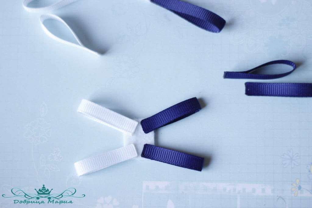 На кусочек фетра приклеиваем наши отрезки ленты самые маленькие 6 см, с одной стороны синим цветом с другой белым, стараемся располагать ровно.