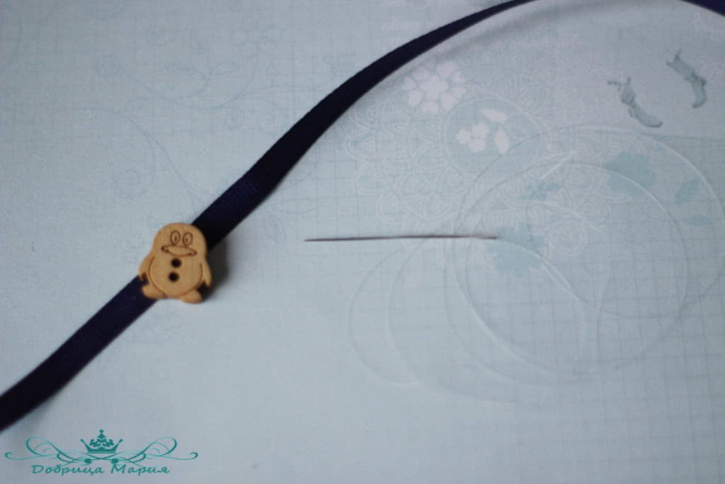 Потом на узкую ленту пришиваем серединку, у меня такой симпатичный пингвиненок.)