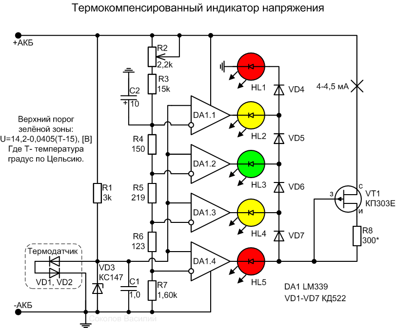 На рисунке изображена одна из возможных эл.схем, собранная на компараторе Lm339 с термокомпенсацией. HL1 будет гореть при недозаряженном или плохом аккумуляторе. HL2 – это недозаряд, значит, требуется зарядка. HL3 – напряжение в норме. HL4 – небольшой перезаряд. HL5 – недопустимый перезаряд. Остановить зарядку необходимо при загорании HL4.