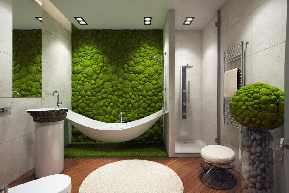 В мокрой зоне ванной комнаты с постоянно высоким уровнем влажности (район ванны, душевой) отлично приживется мох. Около раковины или унитаза для вертикального озеленения в квартире используют влаголюбивый сциндапсус, спатифиллум.