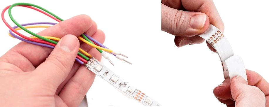 Лента может быть однотонной или многоцветной. Разделена на равномерные сектора с обозначенными местами разреза и группой светоизлучающих источников на каждом участке. Светодиоды подсоединяются друг к другу последовательным соединением.