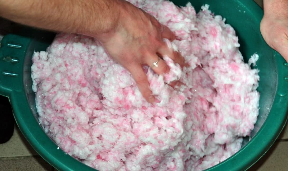 Если используются различные волокна, такие как вата, нитки, то их нужно измельчить, быстрее это сделать миксером.