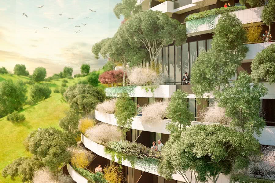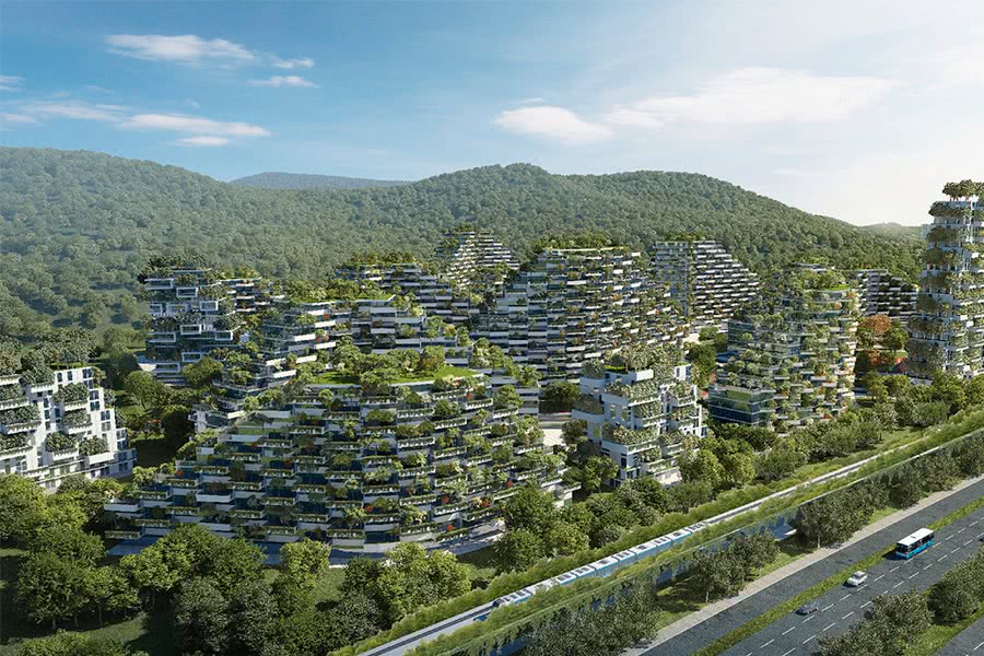 Растения при таком озеленении высаживают на балконах, террасах и крышах. Примером зданий-лесов могут служить современные постройки в китайском городе Лючжоу.